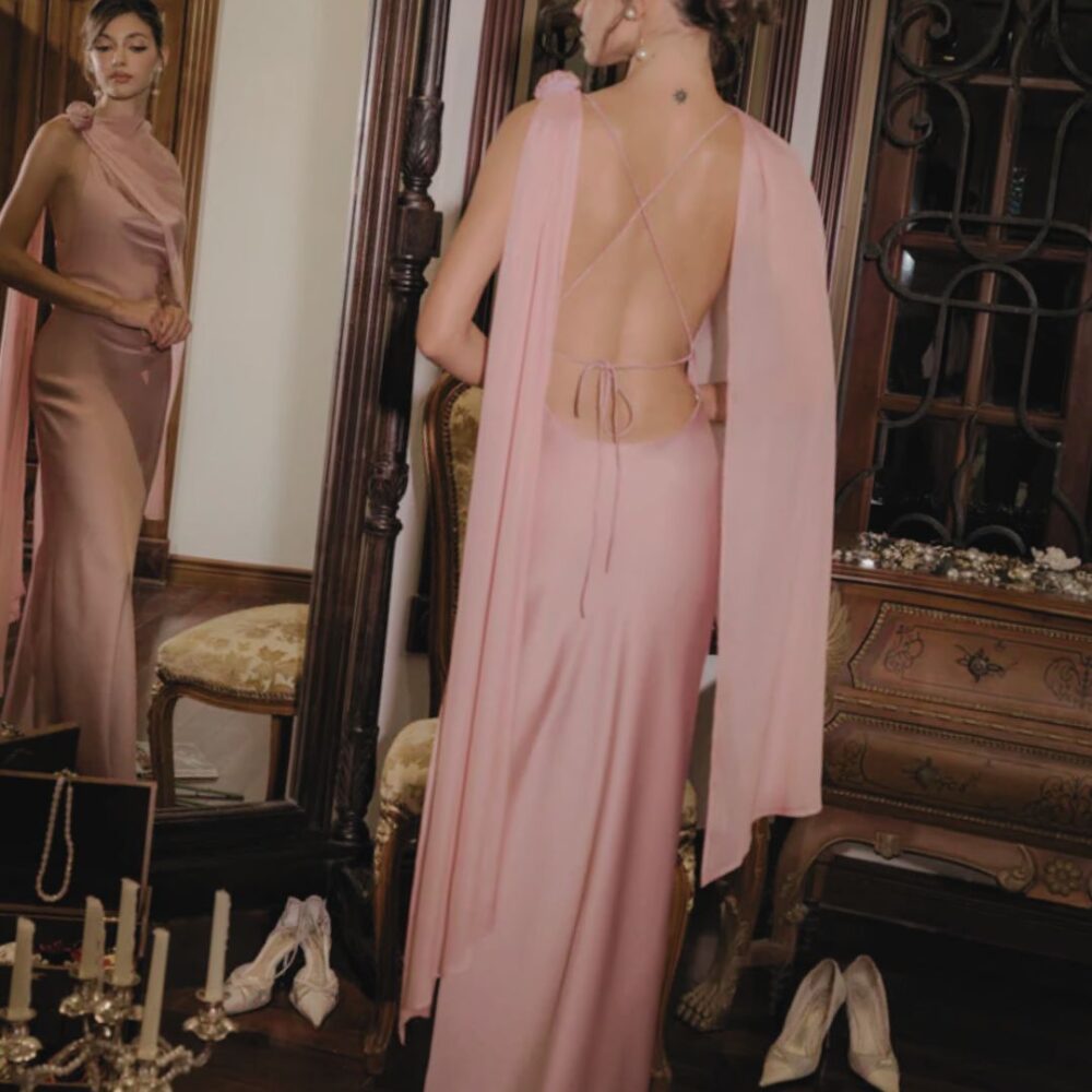 A portrait of modern romance, the “Rose Veil” DR346 gown is a celebration of femininity and poise. Sculpted from blush-toned satin, its form-fitting silhouette flows into a floor-length hem, exuding timeless glamour. A sheer organza overlay drapes gracefully from one shoulder, anchored by a hand-crafted satin rose for a soft, ethereal effect. The back reveals a delicate crisscross tie detail, adding a whisper of allure. Whether beneath candlelight or moonlight, this gown evokes the elegance of a rose just past bloom — delicate, refined, unforgettable.